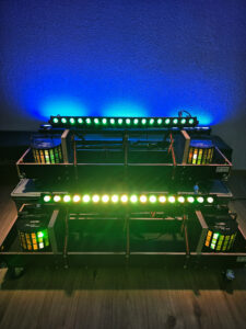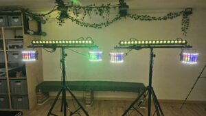 Das Miet Set besteht aus 4x Showtec Techno Derby Strahleneffekt und 2x PURElight LED BAR. Die beschriebenen Geräte sind auf stabilen, hochwertigen Metall-Lichtstativen montiert, die eine zuverlässige und sichere Befestigung ermöglichen. Diese Stative sind höhenverstellbar und können auf eine maximale Höhe von über 3 Metern ausgefahren werden, wodurch sie flexibel an verschiedene Einsatzbereiche eingesetzt werden können. Der Transport, sowie auf- und abbau ist super schnell und unkompliziert, da die Lampen bereits fest montiert und verkabelt sind. Zur richtigen Montage schauen Sie sich bitte das Video zur richtigen Aufbauweise an. Die Lampen laufen am besten im Automatik Betrieb und haben viele abwechslungsreiche Lichteffekte sowie verschiedene Stroboskopeffekte die auf Wunsch auch ausgeschaltet werden können. Dieses Miet Set ist ideal dafür gedacht, um eine tolle Party Atmosphäre zu erschaffen.