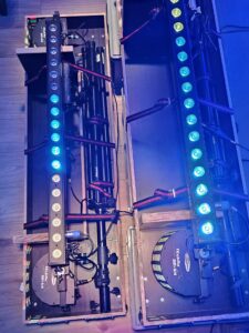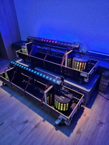 Die Lampen sind in zwei Flightcases verstaut, Außenmaße 145x45cm