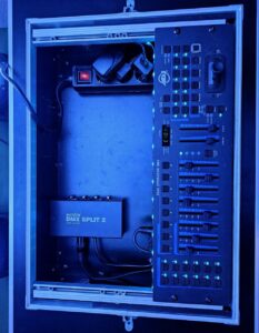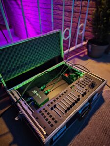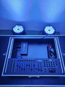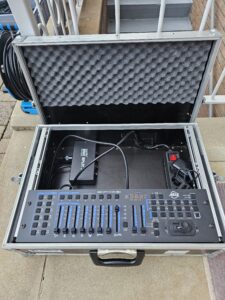 Ein DMX-Steuerpult ist eine Steuerpult für Bühneneffekte und Beleuchtung. Es steuert Scheinwerfer, Lichteffekte und Nebelmaschinen, z. B. für Farben, Helligkeit oder Bewegungen, und ermöglicht das Erstellen, Speichern und Abspielen von Programmen.